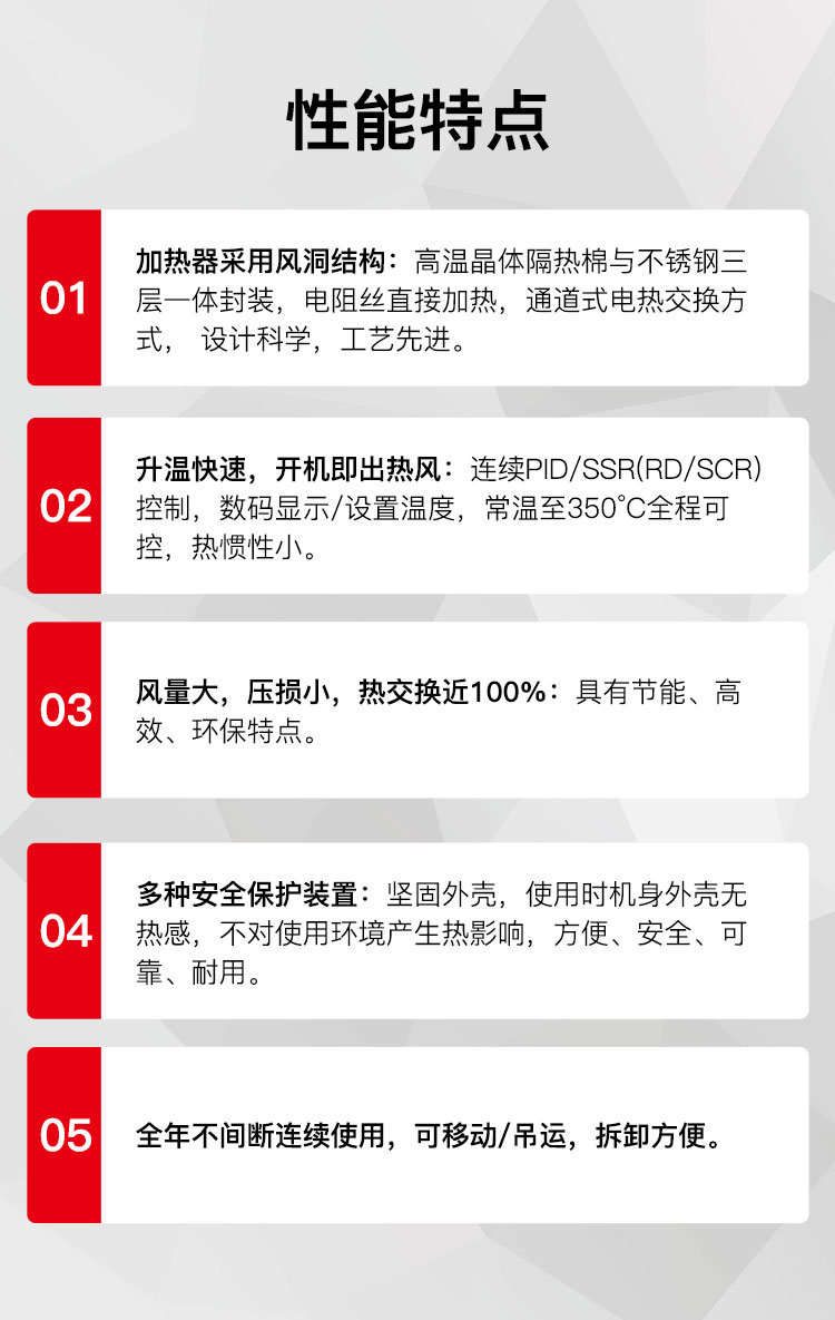 ③热风在出口温度为200°C时,发热丝表面温度仅350°C而已,这种热交换率让本产品达到其它加热器无法达到的要求。