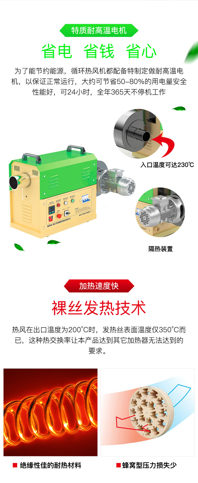 ④为了节约能源,循环型系列热风机都配备特制定做耐高温电机,以保证正常运行,大约可节省50-80%的用电量。