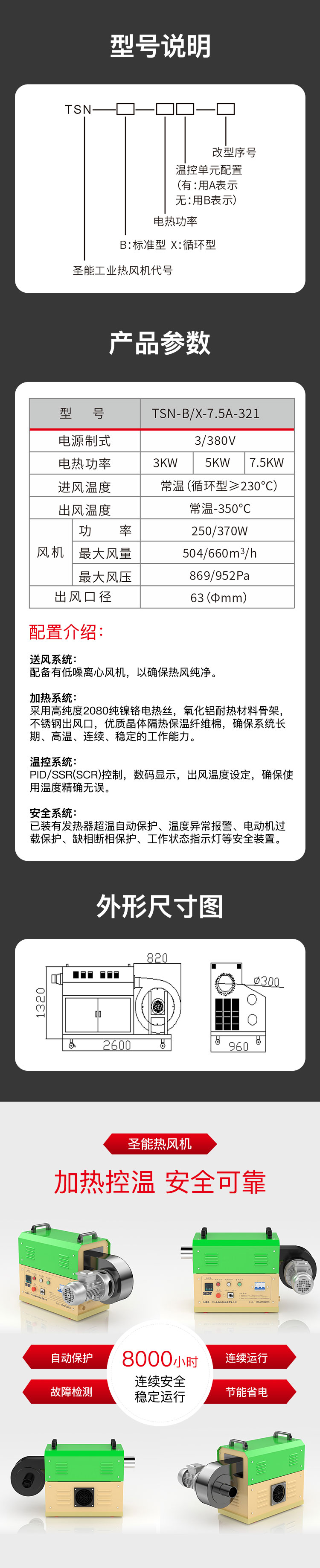 “TSN”工业热风机主要由送风系统、加热系统、温控系统三大部分部分组成。通电后,鼓风机把空气吹送到加热器里,令空气从螺旋状的电热丝内、外侧均匀通过,电热丝通电后产生的热量与通过的冷空气进行热交换,从而使出风口的风温升高。出风口处的K型热电偶及时将探测到的出风温度反馈到温控仪,仪表根据设定的温度检测着工作的实际温度,并将有关信息传递回固态继电器进而控制加热器是否工作。同时,鼓风机可利用风量调节器(变频器、手动)调节吹送空气的风量大小。另外,送风系统及加热器,均有过载超温自动保护装置,总电路也设计了紧急挚,以保证安全,防止错误操作。