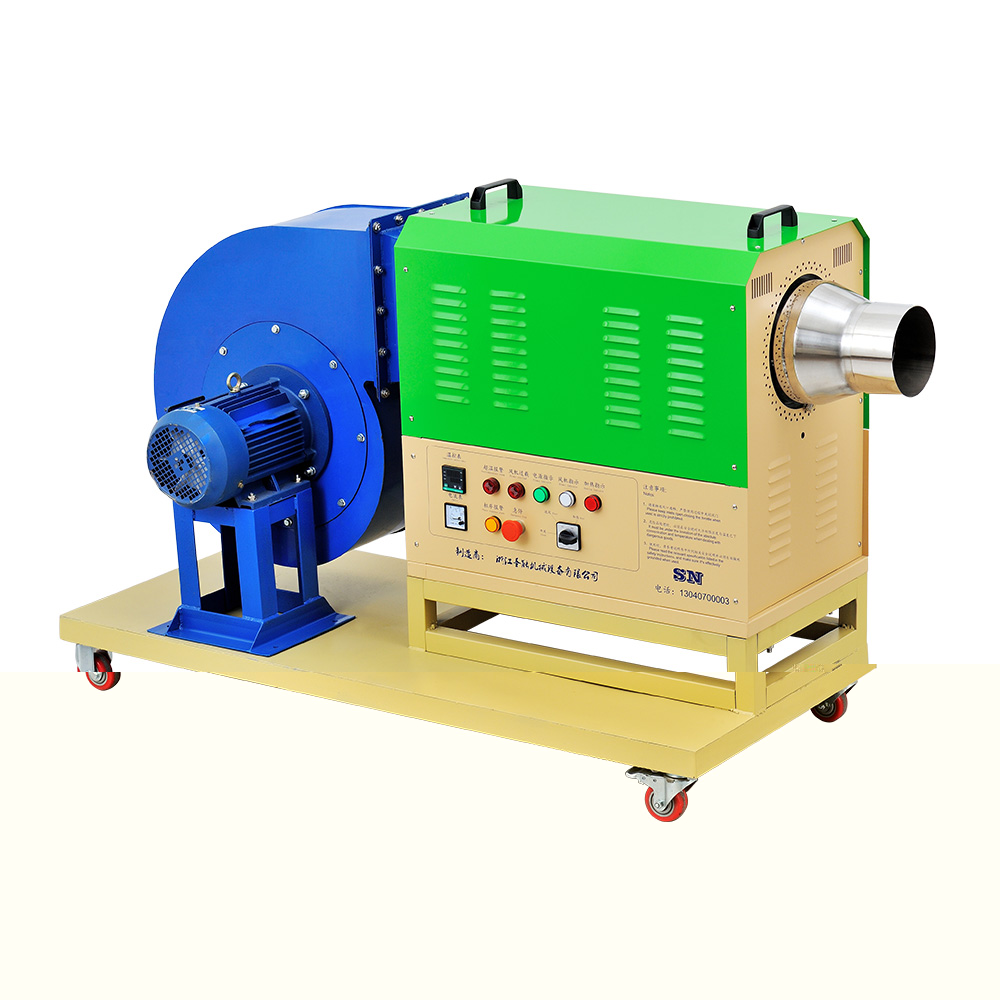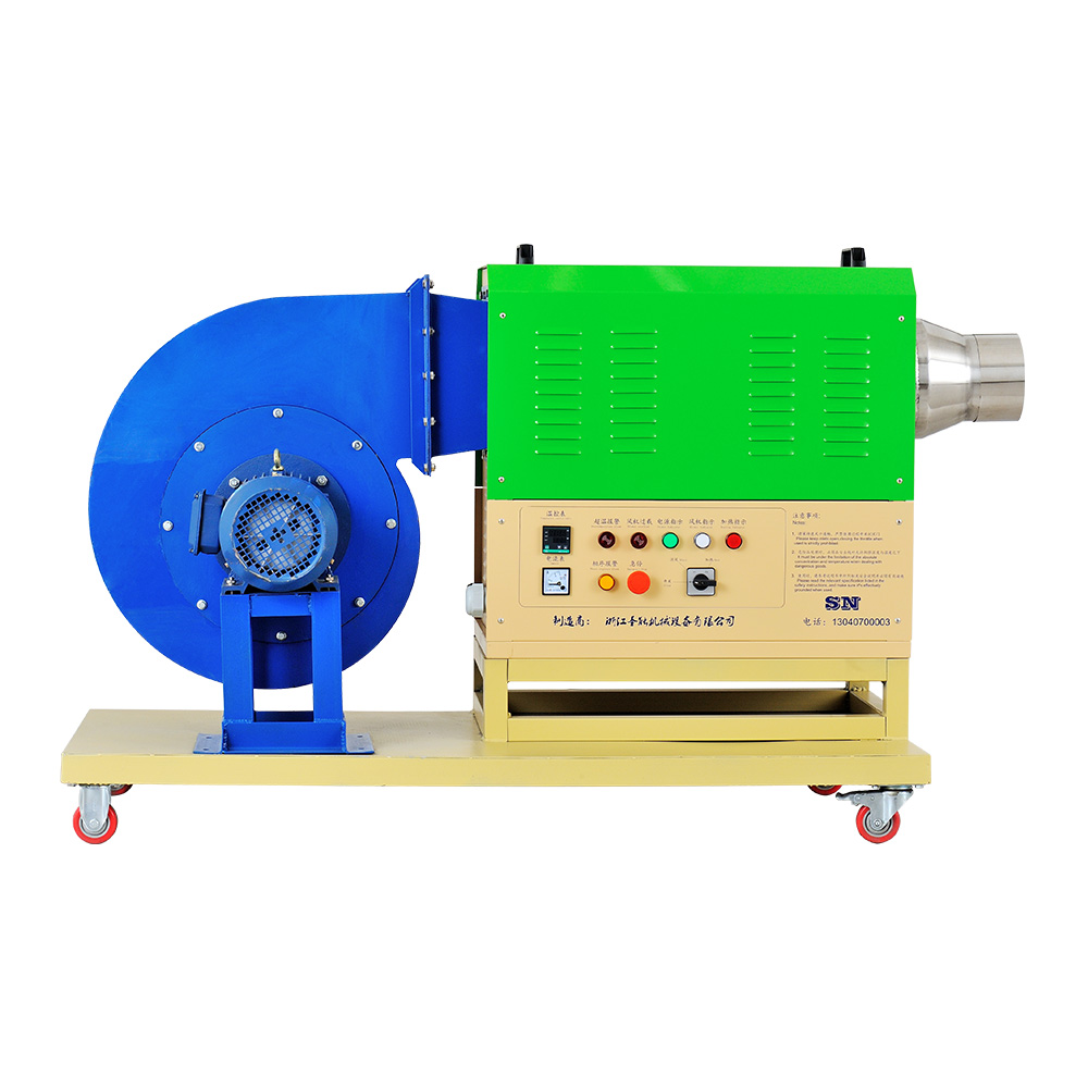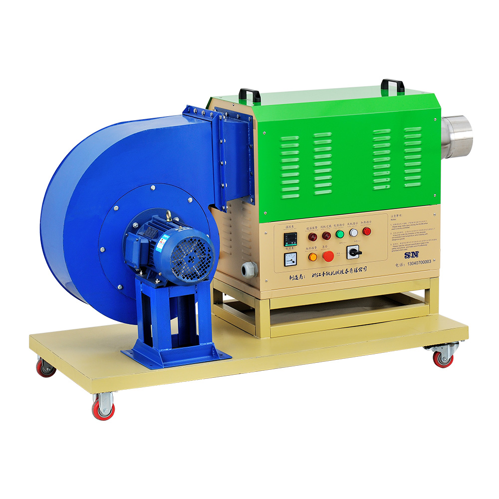 “TSN”工业热风机主要由送风系统、加热系统、温控系统三大部分部分组成。通电后,鼓风机把空气吹送到加热器里,令空气从螺旋状的电热丝内、外侧均匀通过,电热丝通电后产生的热量与通过的冷空气进行热交换,从而使出风口的风温升高。出风口处的K型热电偶及时将探测到的出风温度反馈到温控仪,仪表根据设定的温度检测着工作的实际温度,并将有关信息传递回固态继电器进而控制加热器是否工作。同时,鼓风机可利用风量调节器(变频器、手动)调节吹送空气的风量大小。另外,送风系统及加热器,均有过载超温自动保护装置,总电路也设计了紧急挚,以保证安全,防止错误操作。